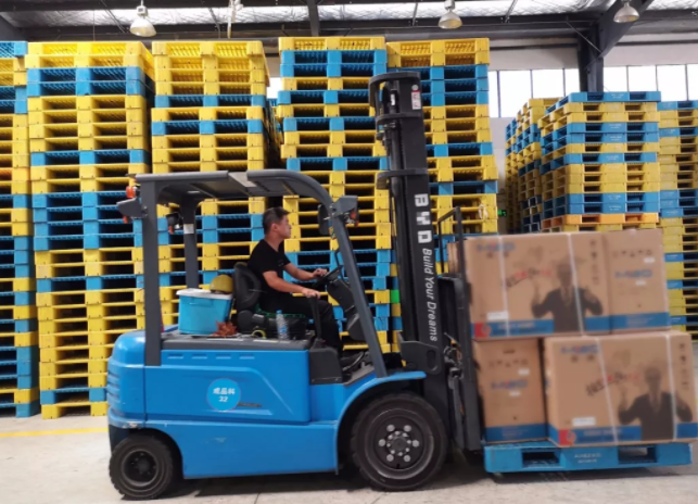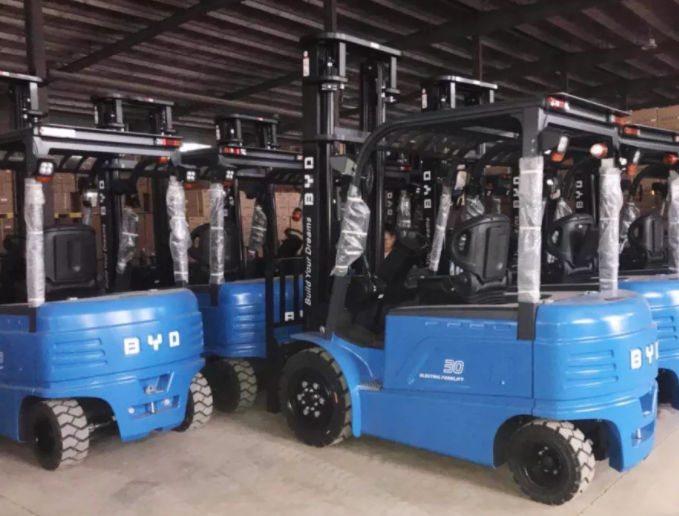 **,比亚迪叉车为潍坊基地提供近百台平衡重式叉车;